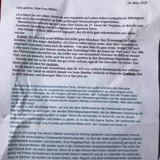 Ich persönlich bin immer noch unendlich stolz darauf, dass ich so mutig für mein Gewissen eingestanden bin – für „Frieden mit dem Feind“. Seitdem bekomme ich von beiden Seiten der Brandmauer Ohrfeigen, genau wie der friedensstiftende Freund im Theaterstück „Kunst“ von Yasmina Reza, der sich zwischen die verfeindeten Freunde stellte. Ja, auch die AfD Menschen sind auf mich hergefallen und kommen auch nicht auf die Idee mich zu verteidigen. Faule Menschen, genauso wie ihre Gegner. Der Hass ist wie ein Gift, eine Krankheit die Seelen verfaulen lässt und nach 10 Jahren Hass in dieser Stadt sind viele Menschen faul geworden. Der Krieg und der Tod ist das Endstadium der Krankheit "Hass". Wir müssen aber diese Krankheit heilen, solange wir das können!